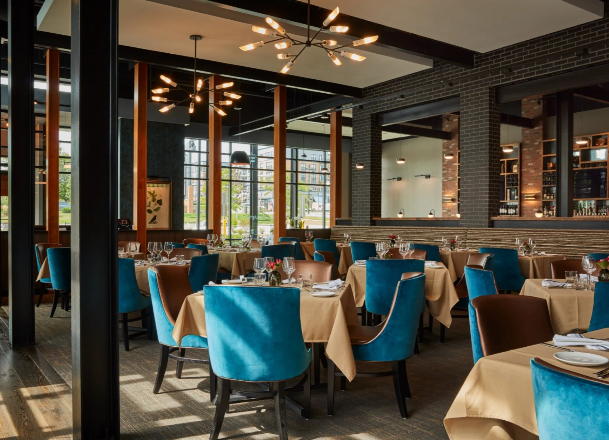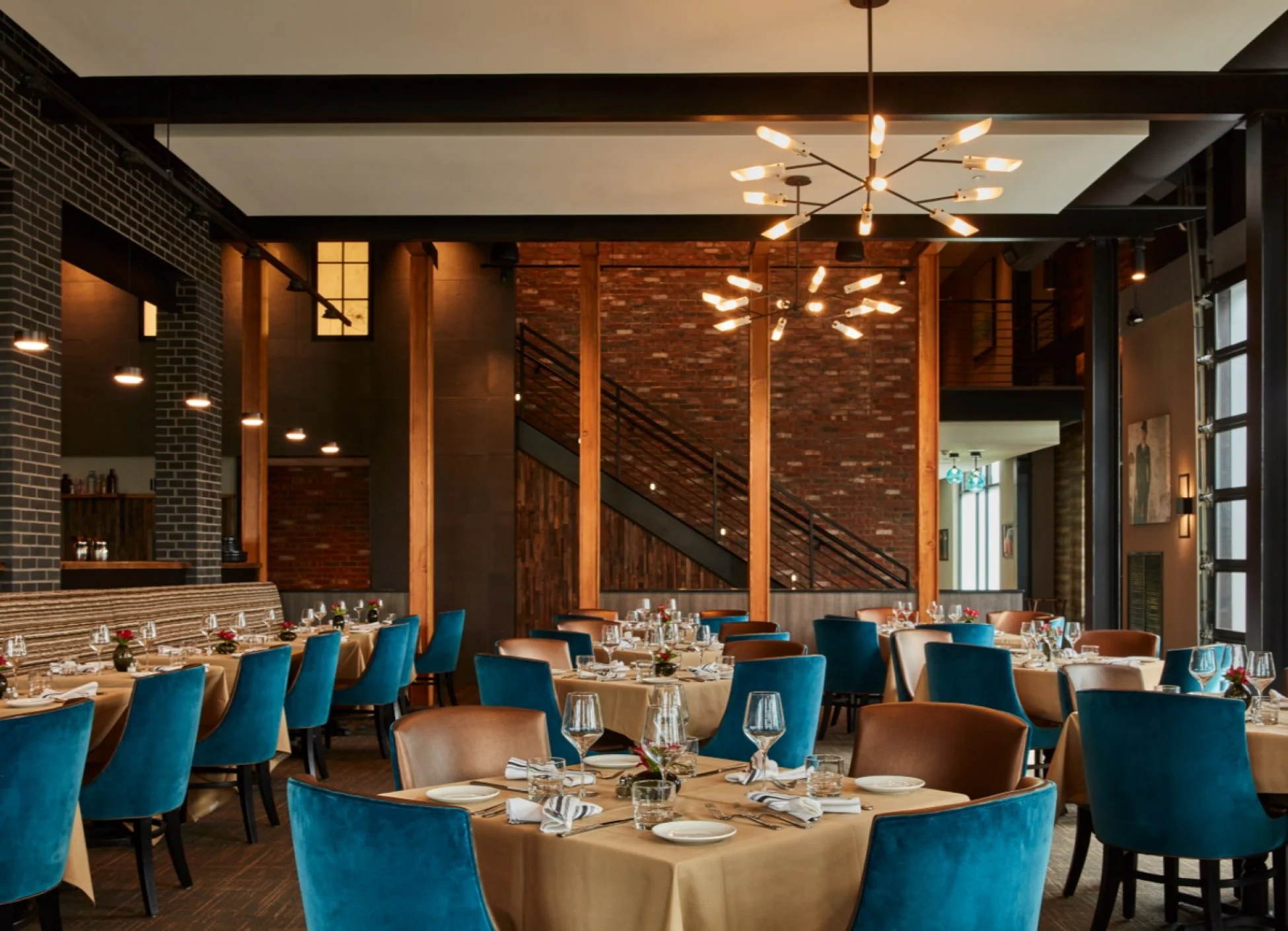9,200 sf restaurant featuring ground floor dining, exterior patio and bar, and mezzanine bar and dining area for private parties. Services included facade, patio, signage, and interior design and documentation.