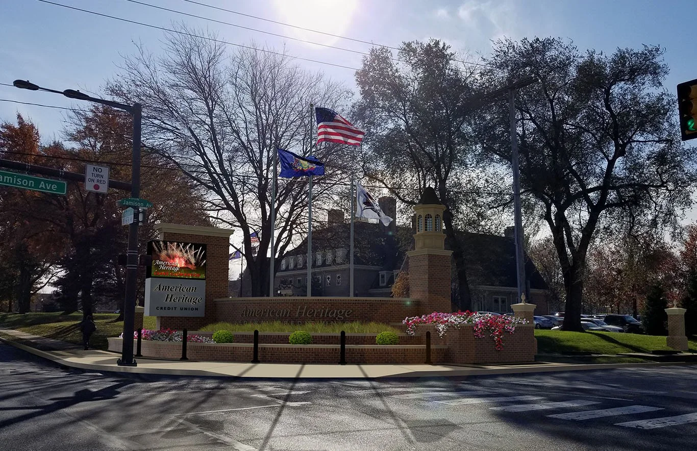 Concept design and rendering for new signage and streetscape features for American Heritage Federal Credit Unions main campus.